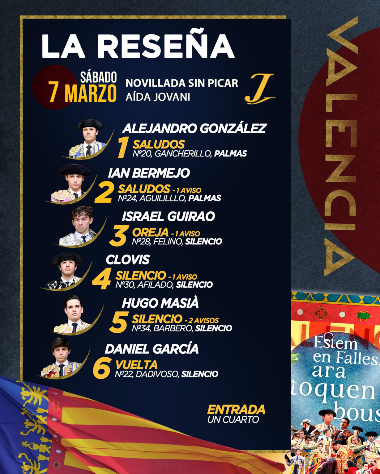 La novillada sirvió para abrir el ciclo fallero y dejó también el triunfo de Israel Guirao, alumno de la Escuela Taurina de Valencia, quien logró cortar una oreja tras un trasteo de gran temple al tercero de la tarde. Muy cerca del trofeo quedó también Daniel García, de la Escuela Taurina José Cubero “Yiyo”, que dio una vuelta al ruedo tras petición después de una faena de peso al sexto, destacando especialmente una tanda de naturales de gran profundidad.